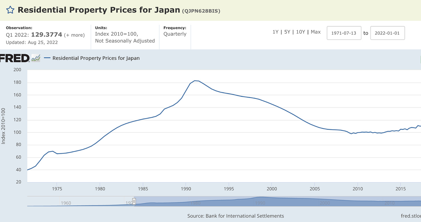 After significant consumer price inflation from both increases in money supply and decreases in goods available, the Fed is now reversing 40 years of unidirectional policy. So far we’ve seen the S&P 500 lose about 30% over 8 months while rates have moved from 0 to 3.25 percent and the Fed promises evermore more hikes. It looks to me like the same dance. Do we think US housing might come to look like Japan?