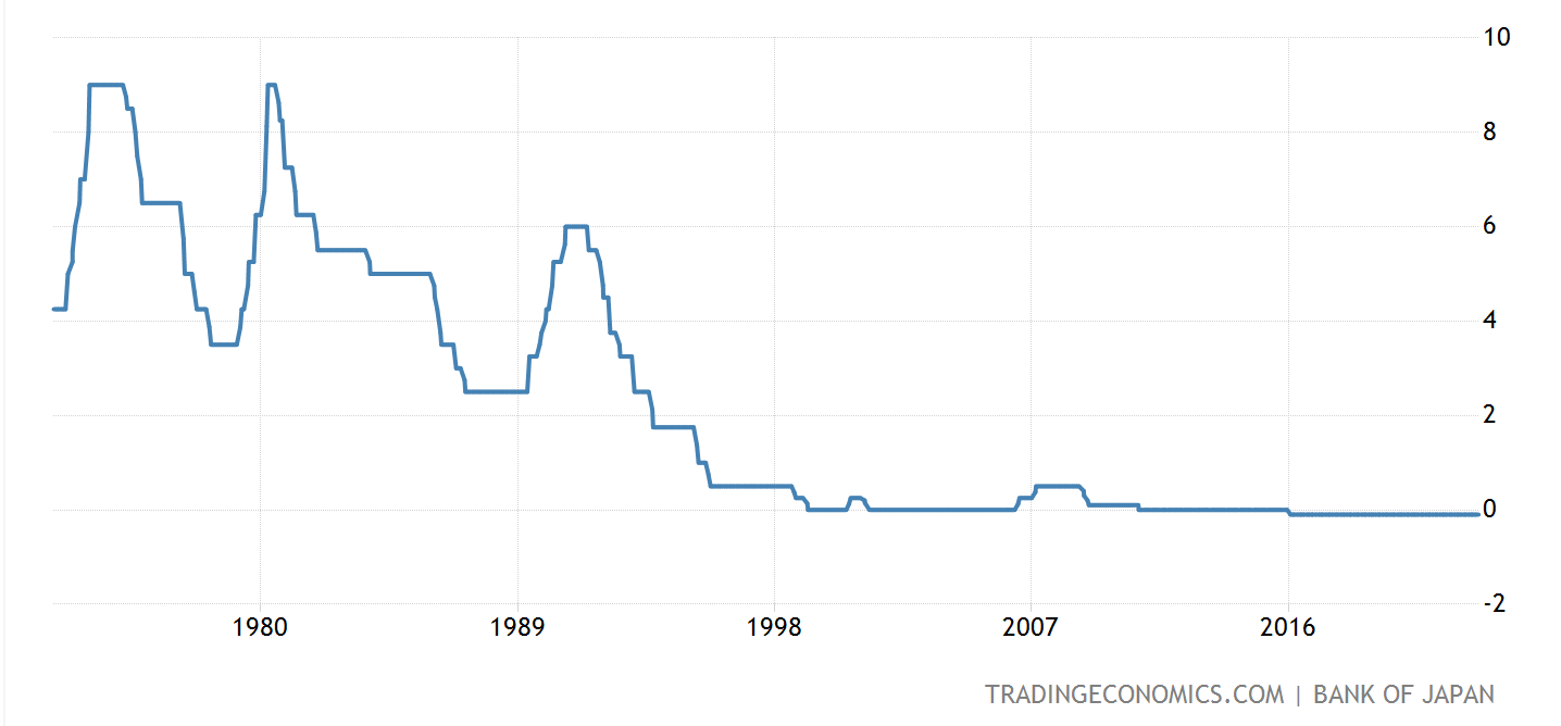 Very few people outside of finance seem to know that policies in the US (and thus 70+% of the globe) have lagged Japan by a decade or two. They went to zero interest rate policy (ZIRP) faster and harder than any other nation from a peaks in 1981 and 1990. Here are the interest rates set by the Bank of Japan (BOJ) over the last five decades: