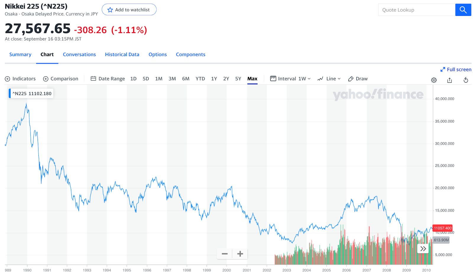 Both of those markets peaked and then popped from around 1990 - 1991. The Nikkei can be thought of as the Japanese equivalent to the S&P 500. Below is the Nikkei price level over time with data from left to right moving us towards the present.